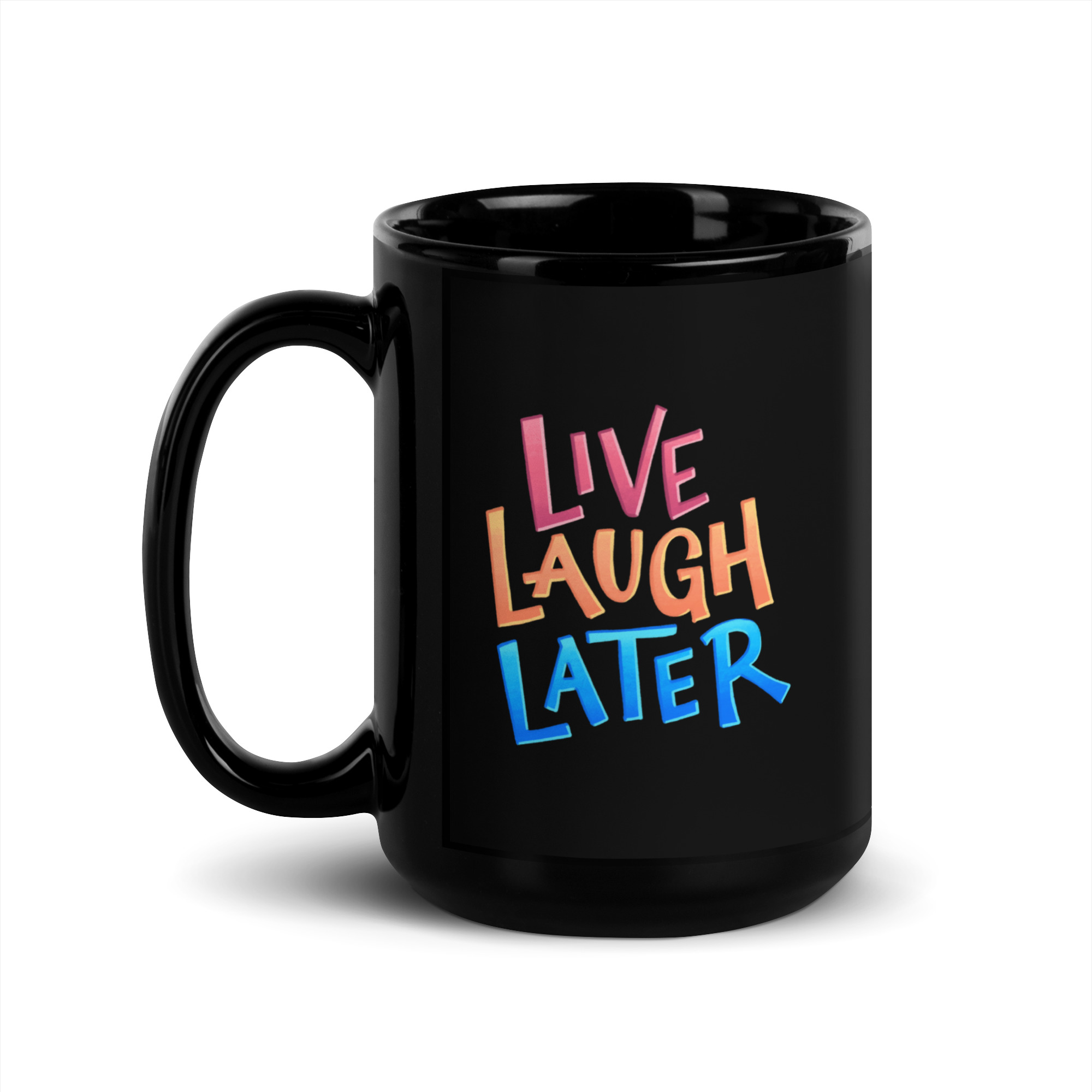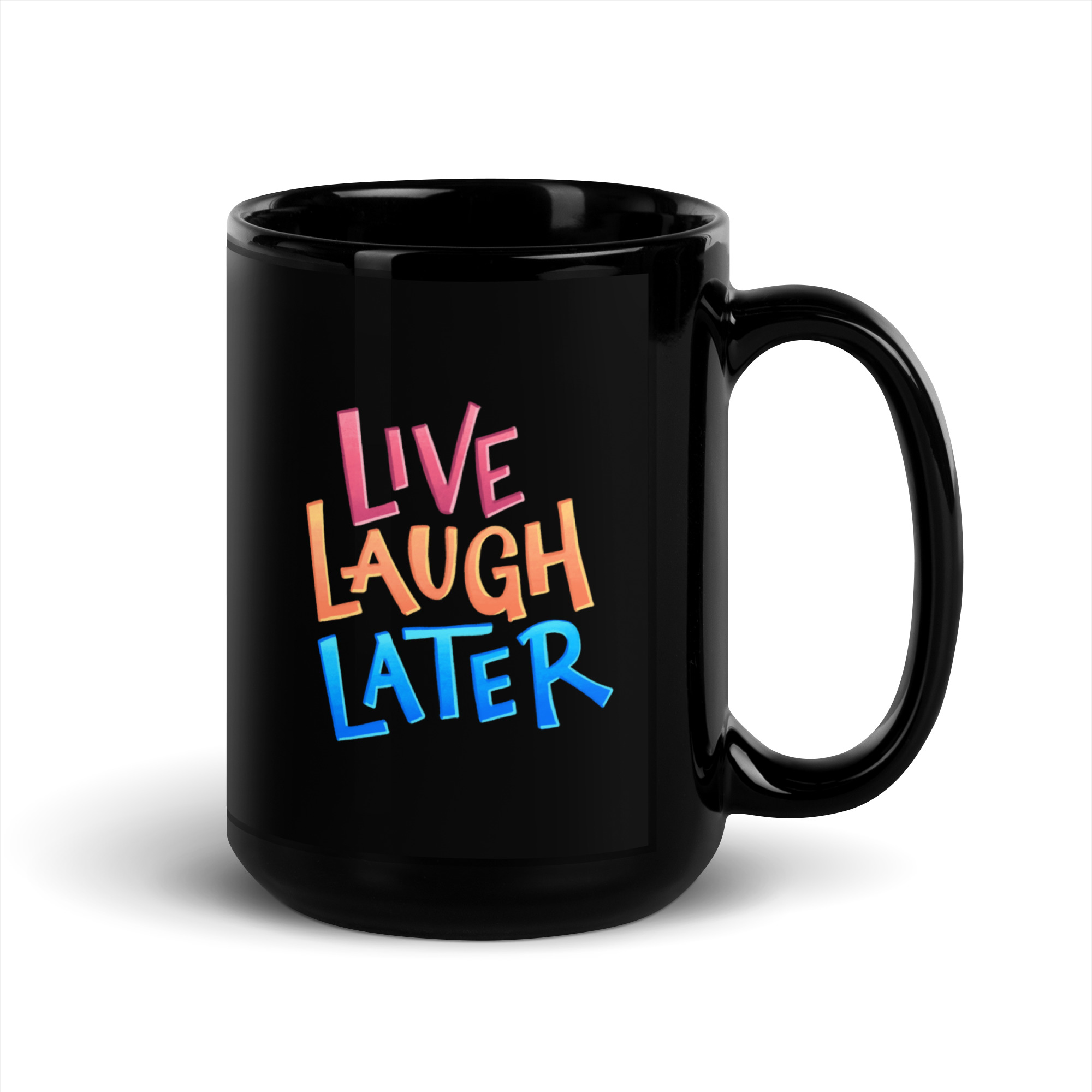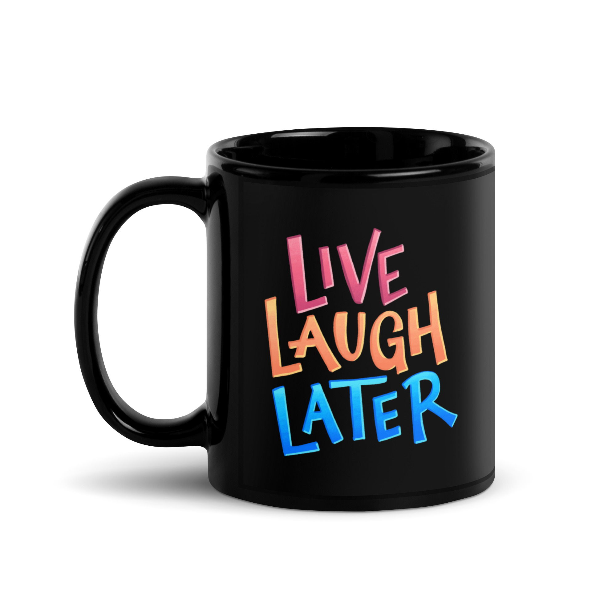 This mug is the perfect vessel for procrastination-fueled ambition. “Live, Laugh, Later” in Dani Donovan’s signature hand-lettering, printed on a sleek black glossy finish that makes every sip feel slightly more intentional—even if you’re still staring at the same to-do list from three days ago.